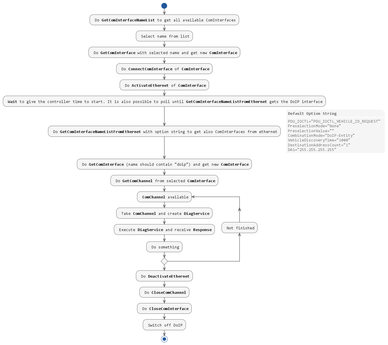 The basic proceeding how to establish a DoIP communication is described in the following pseudo code example.
