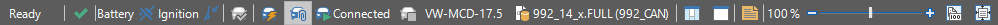 At the bottom-most of the OTF is the Status Bar. It provides useful information of the OTF current state and an easy way to check the current result of the last validation, to access the DoIP configuration, to change the current MVCI-Server or the current ODX Database and to adjust the OTF tool window layout or the workflow designer appearance.