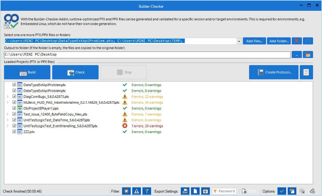 With the Builder-Checker Addin, runtime-optimized PTX and PPX files can be generated and validated for a specific version and/or target environments. This is required for environments, e.g. Embedded Linux, which do not have their own code generation.